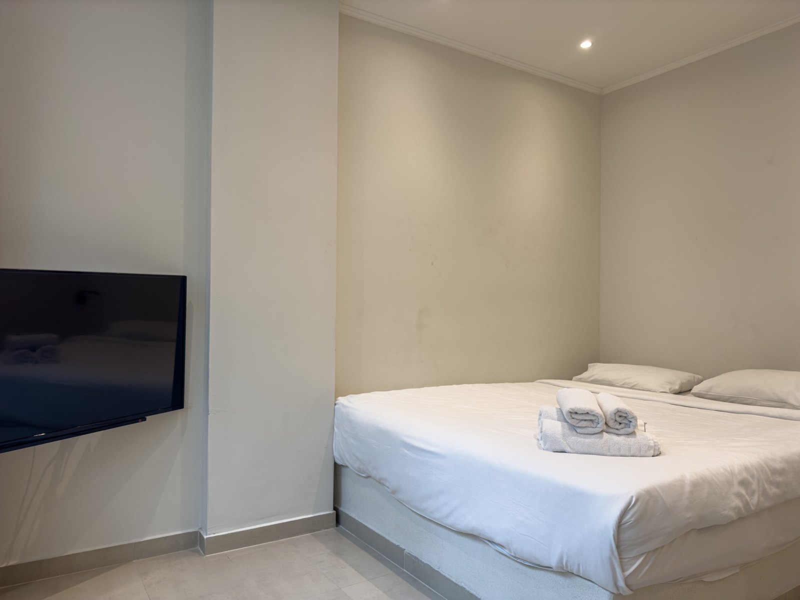 The studio features a luxurious queen-size bed with premium linens, a wardrobe, and a well-thought-out layout that ensures both comfort and functionality.